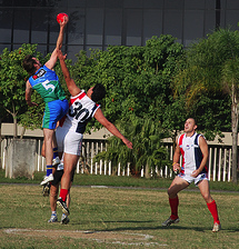 With many struggling in the stifling tropical humidity, some class performances by new recruit Chapman and a lovely cameo by Australian tourist Dan ‘the difference’ saw the Chilean tourists get home for a narrow last quarter win. The ability to recruit last minute ring-ins has always a feature of international footy fixtures and dragging Dan away from the surf for the day had proved to be a decisive move.